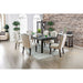 Rustic charm meets upscale design in the form of this stunning collection. The rustic wood grain and antique black finish take you to a charming farmhouse somewhere in the countryside, achieving an inviting, homey atmosphere that will have family and friends coming back for more. Elegant linen-like chairs add sophisticated appeal with their wingback sides, button tufting and nailhead trim.